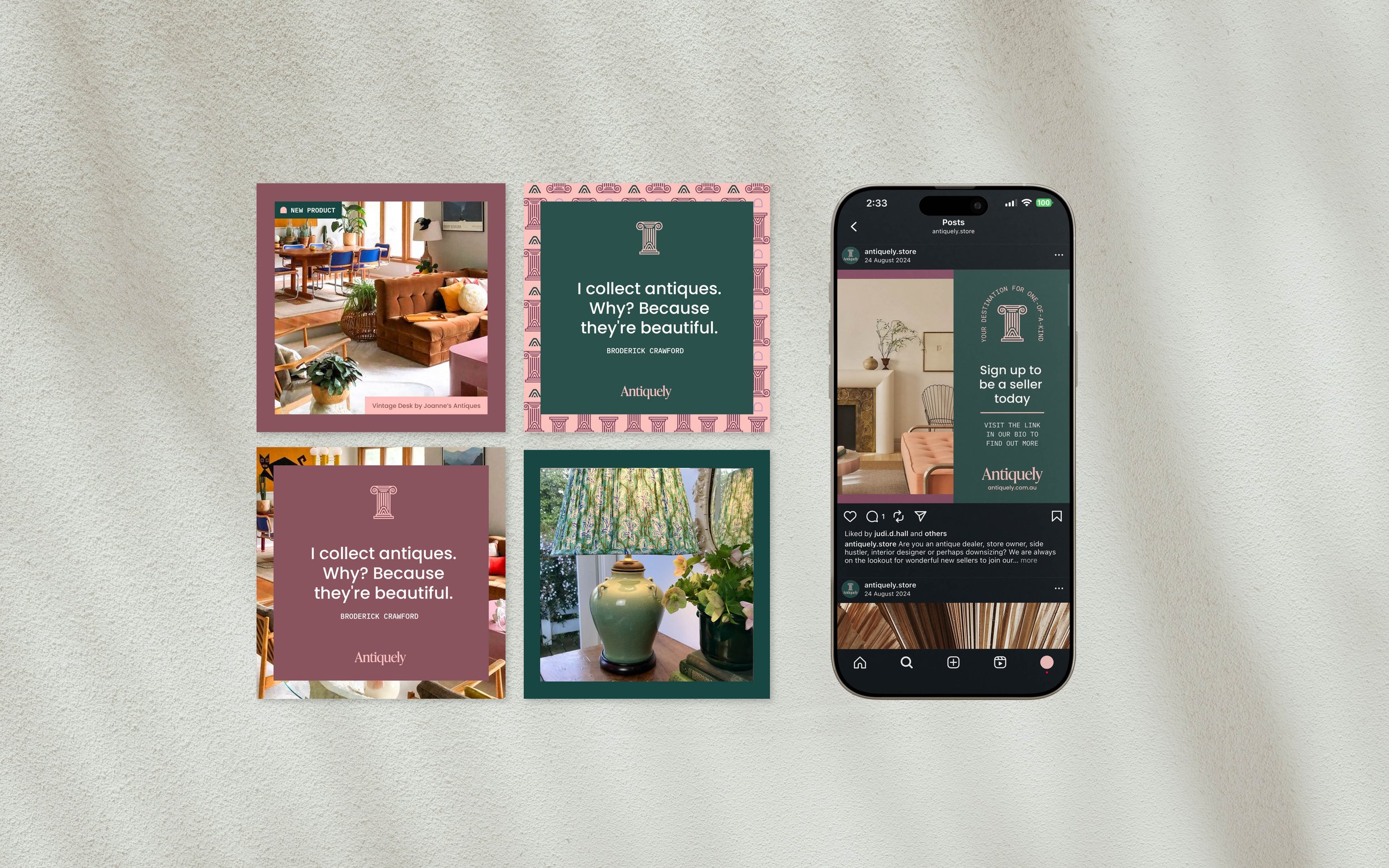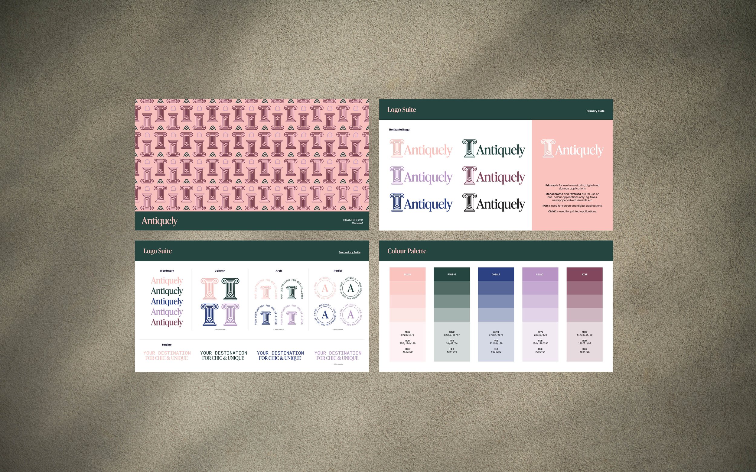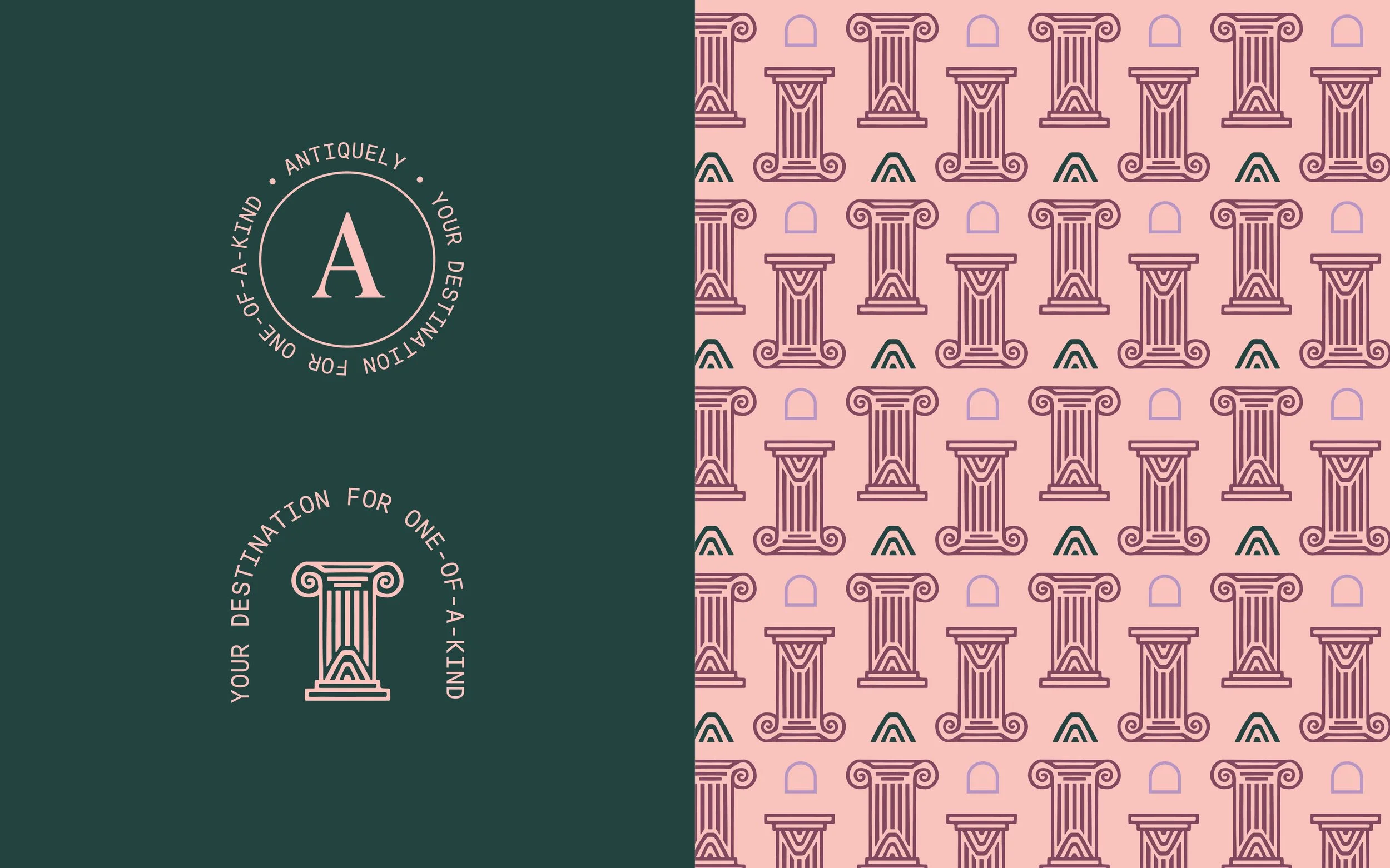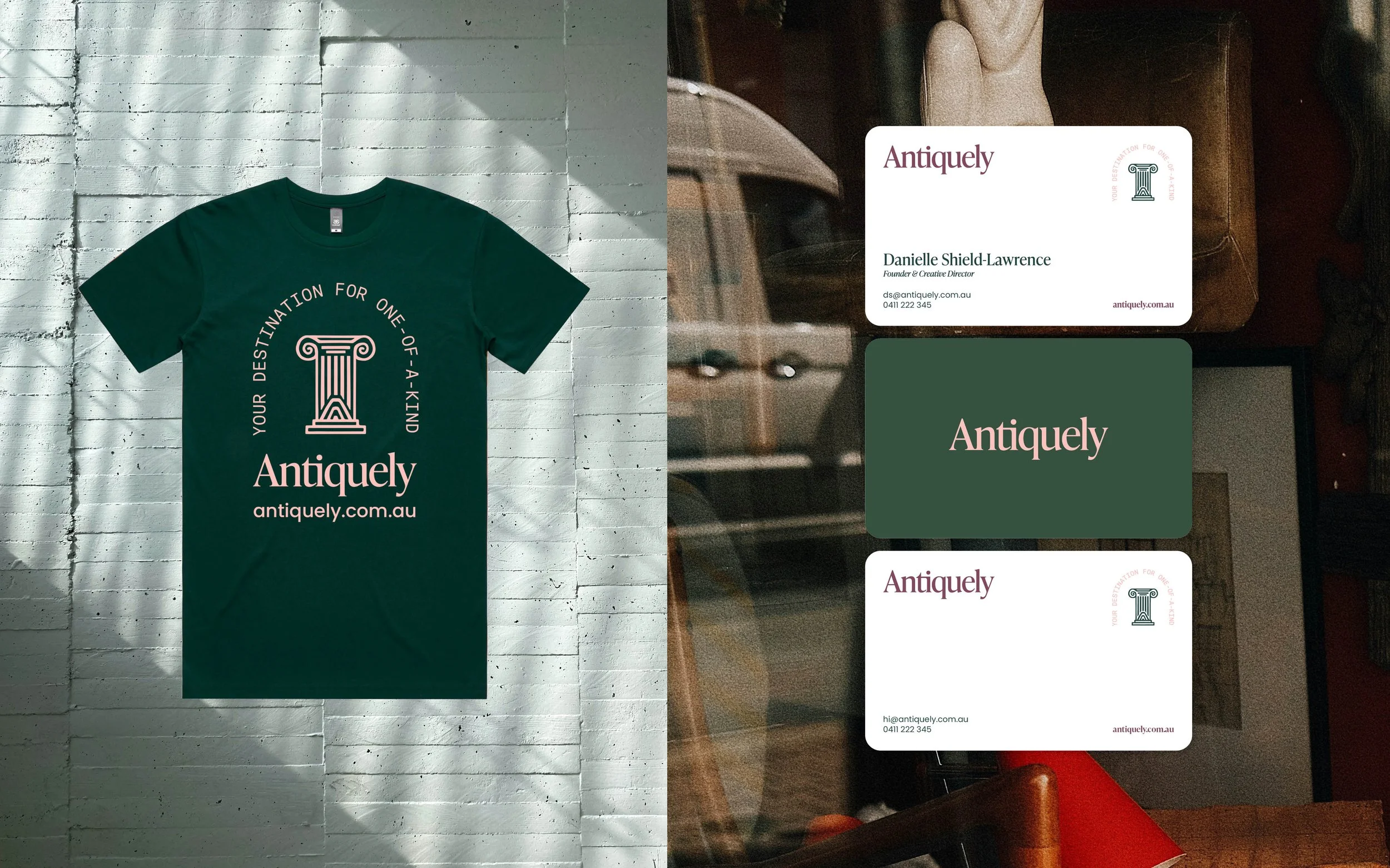 Founded by entrepreneur Danielle Shield-Lawrence, Antiquely is an online marketplace that brings together buyers and sellers of second-hand homewares. Inspired by Danielle’s personal love of antiques and thrifting, the brand was developed to blend old-world charm with a fresh, contemporary colour palette. Anchored by a handcrafted column motif, the visual identity celebrates the character, texture and imperfect beauty inherent in pre-loved homewares.